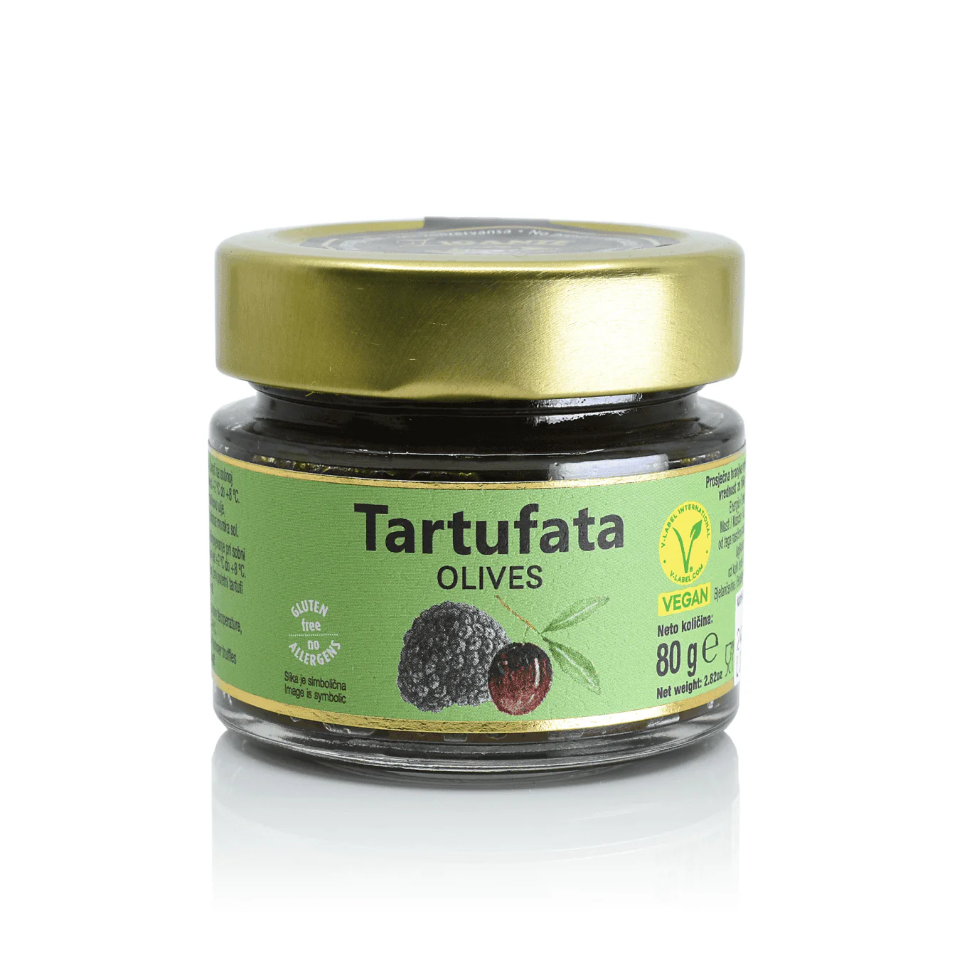 Ingredientes: Aceitunas negras, trufa de verano (Tuber aestivum Vitt.), aceite de oliva extra virgen, aromas, sal.